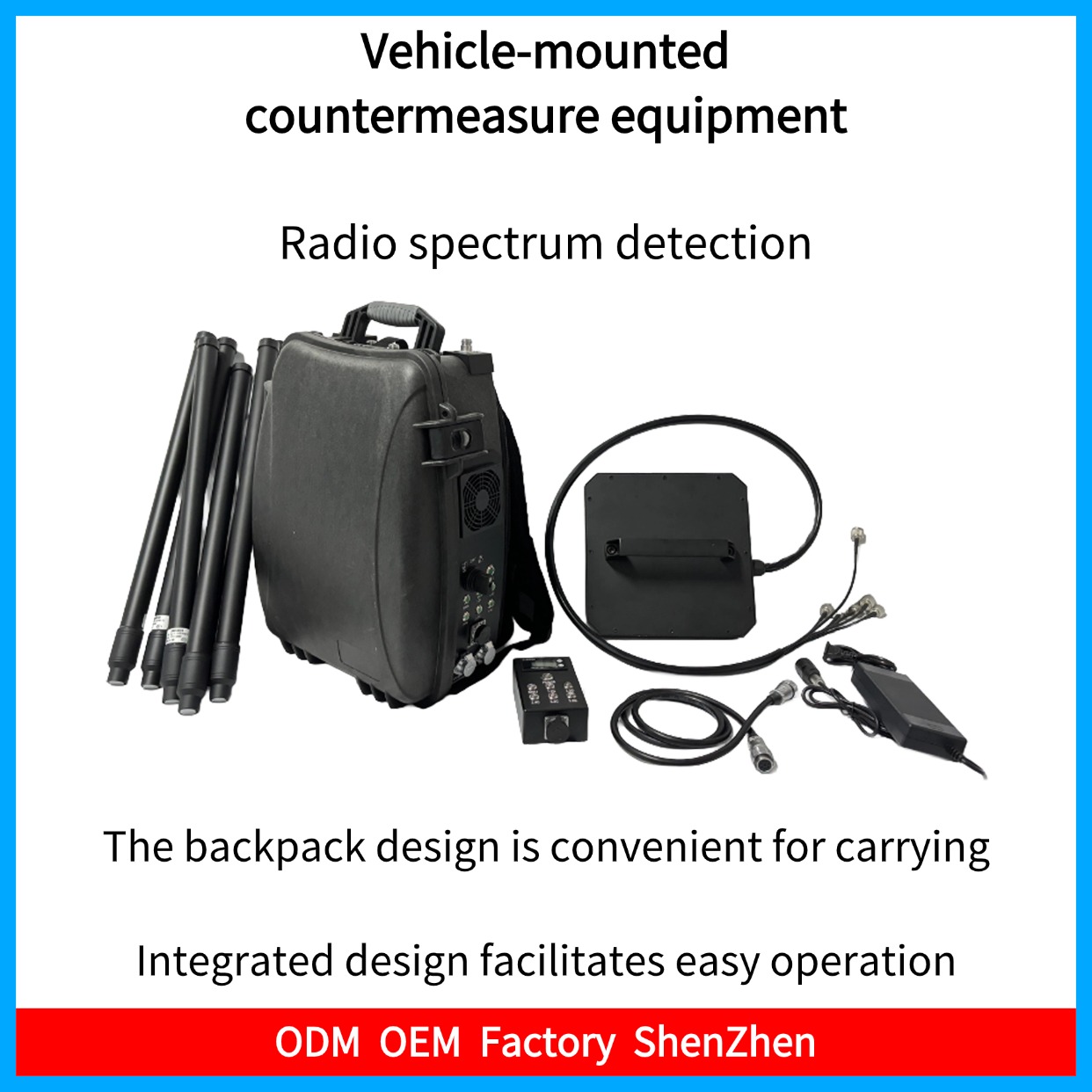 With the booming development of the drone market, drones are widely used in various aspects of social life. However, inevitably, the use of drones also brings some hazards, such as the frequent occurrence of black flying drones in no fly zones, the use of drones for poisoning, and their application in the field of warfare. This product is mainly used for black flying drones to drive away and make emergency landings within the field of view. This device is customized according to customer requirements and adopts a backpack style design, which can be carried for a long time. It has a built-in battery, making it more convenient to use without restrictions. At the same time, the device is equipped with two antenna modes: external omnidirectional and handheld directional, meeting various usage needs. The equipment adopts narrowband interference technology and radio frequency suppression technology to cut off the connection between the drone and the remote control, thereby forcing the drone to return forcibly. And after being controlled, the drone has cut off the image transmission channel, and will not be able to transmit videos, aerial photos, or receive any instructions from ground remote controllers, thus achieving the goal of protecting key areas and preventing privacy from being leaked.