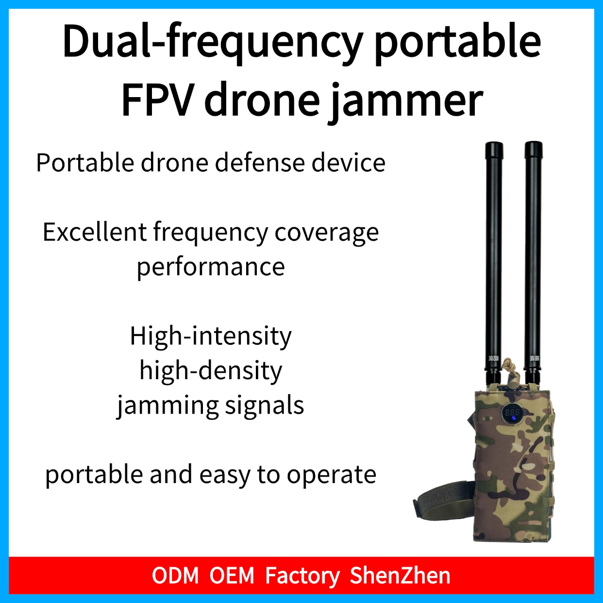 This dual-band handheld drone jammer can generate high-intensity and high-density jamming signals, ensuring effective interference with drones. By transmitting jamming signals within the drone's operating frequency band, the device can prevent the drone from receiving or processing commands normally, thus preventing it from flying or forcing it to land.